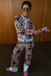 Our iconic bandana print, in a soft stretch weighty knit. With ribbed trims and cuffs for a luxe finish, and a complementary neck tie that can be styled a multitude of ways for an extra element of texture. The brown and blue contrast feels so chic and paired with the matching joggers, it's definitely an effortless everyday co-ord!