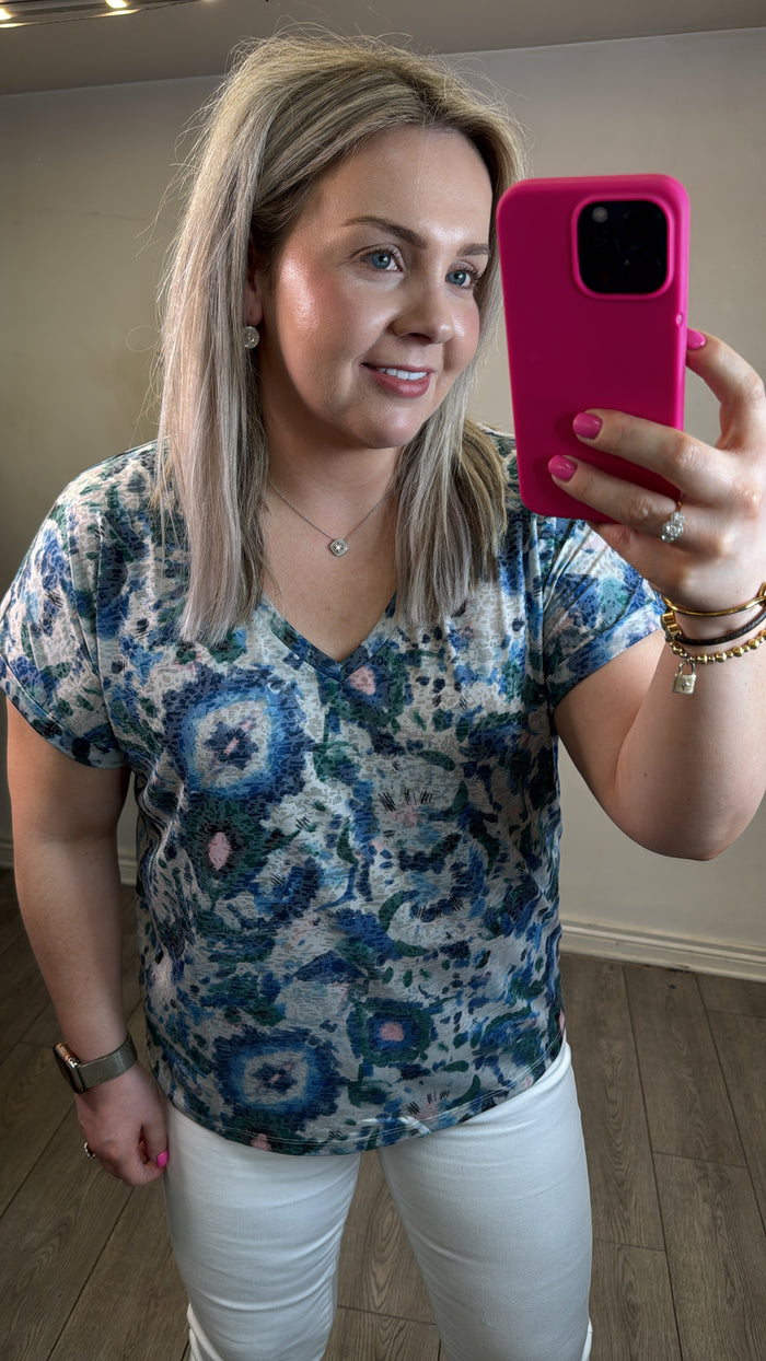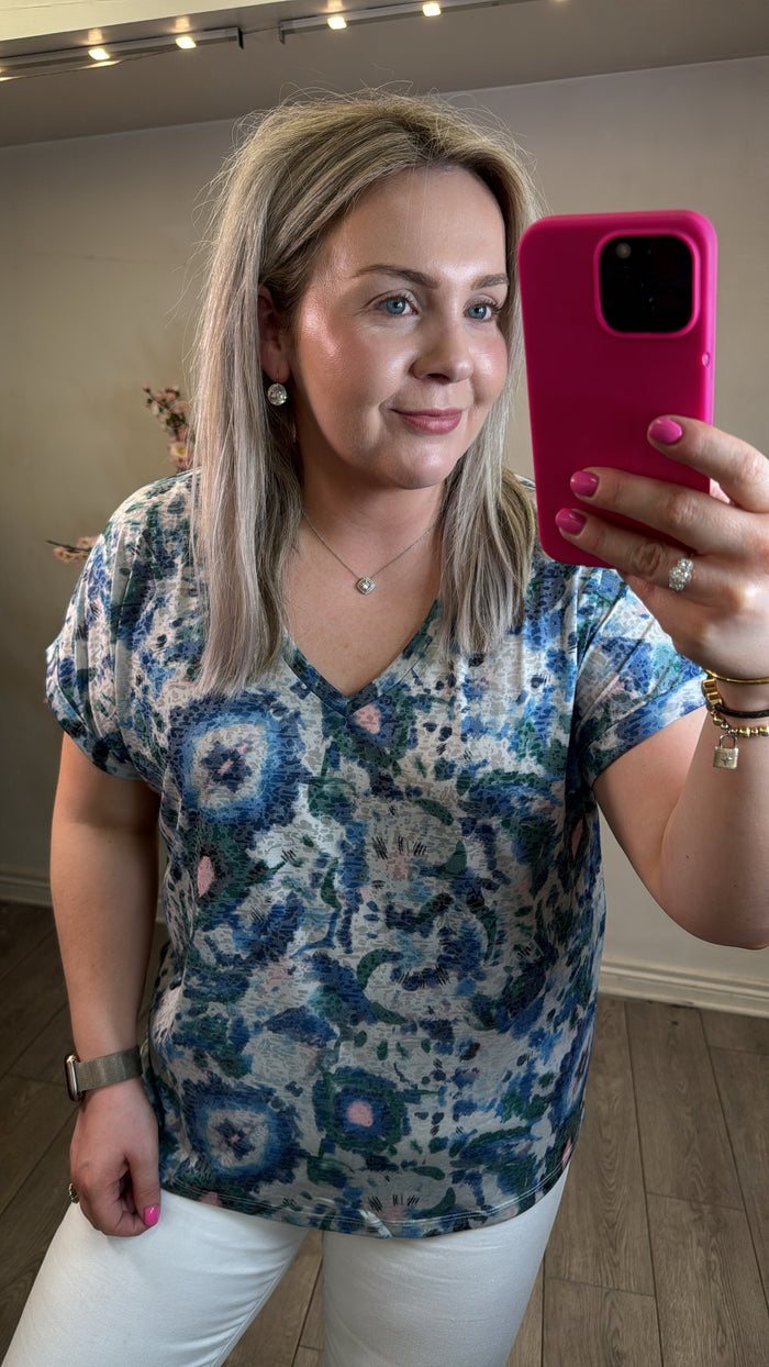 Kaffe Karuffalo Baby Blue/White/Navy Abstract Printed V-Neck Top