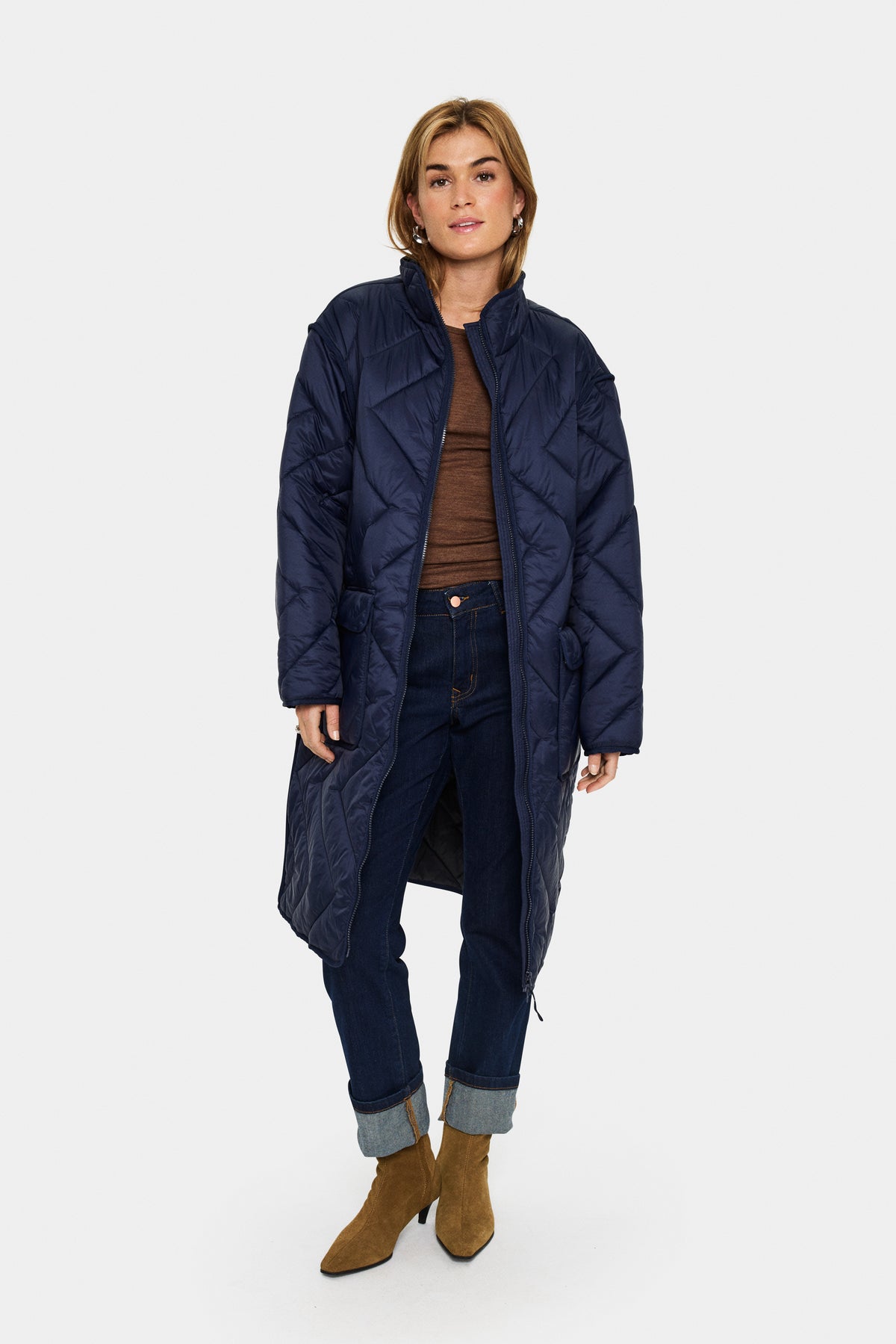 Long quilted coat in a rich navy with high collar and zip closure. Designed with large front pockets and geometric stitching for a structured look. The model is 179 cm tall and is wearing a size S.