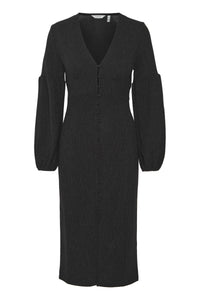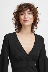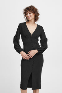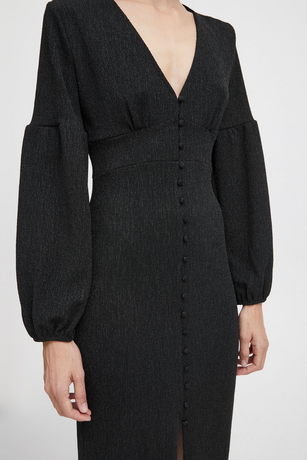 A gorgeous black v-neck dress with a hint of sparkle in the fabric. Featuring long sleeves, waisted detailing, buttons down the front, midi length and a split up the front. Dress is a bodycon fit with stretch fabric to show off the curves, we recommend taking your normal size or if you are in between sizes then size up as it is a very fitted style.
