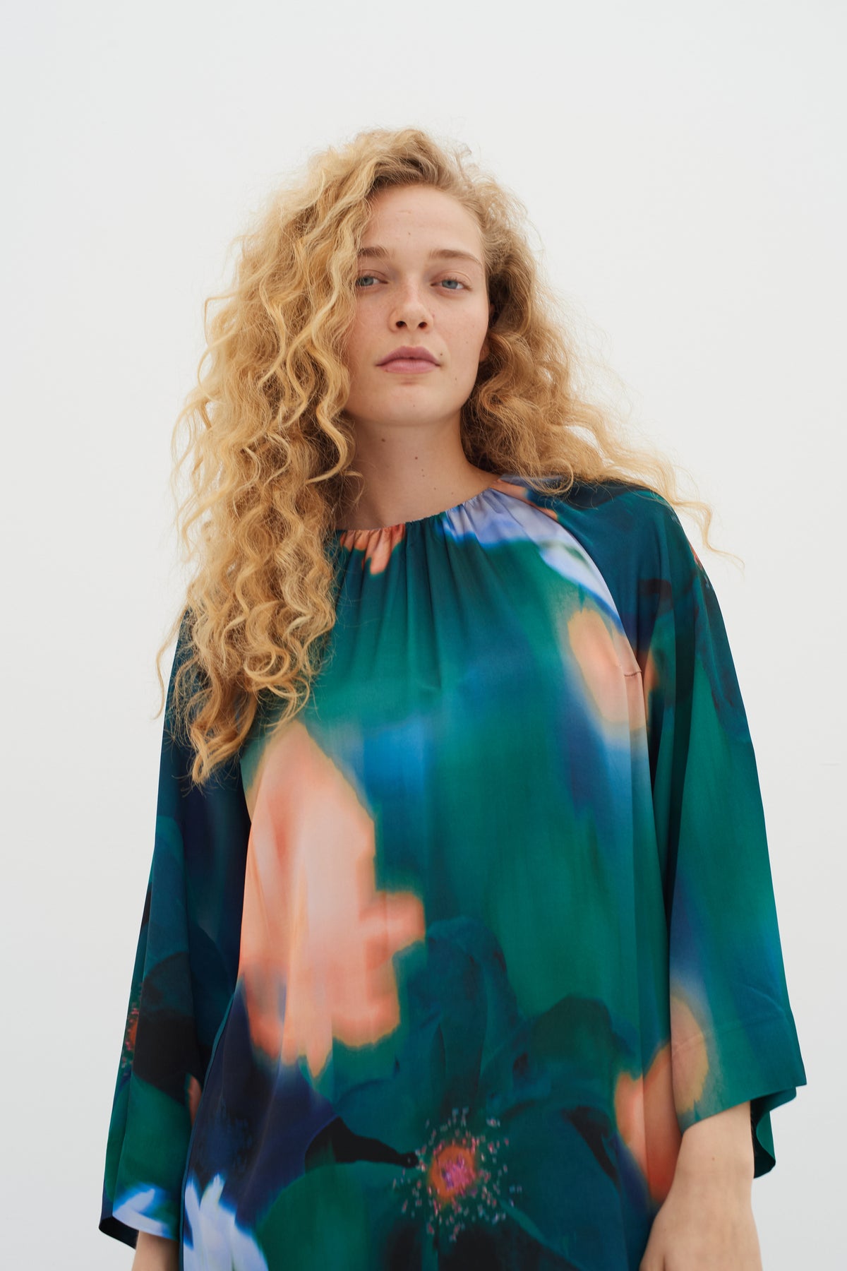 A gorgeous printed dress from InWear in the most amazing fabric! Featuring shades of emerald green ,navy, peach, baby blue, coral and beige. Ankle length and a relaxed fit with 3/4 sleeves. We recommend sizing down in this dress as it is a very generous fit.