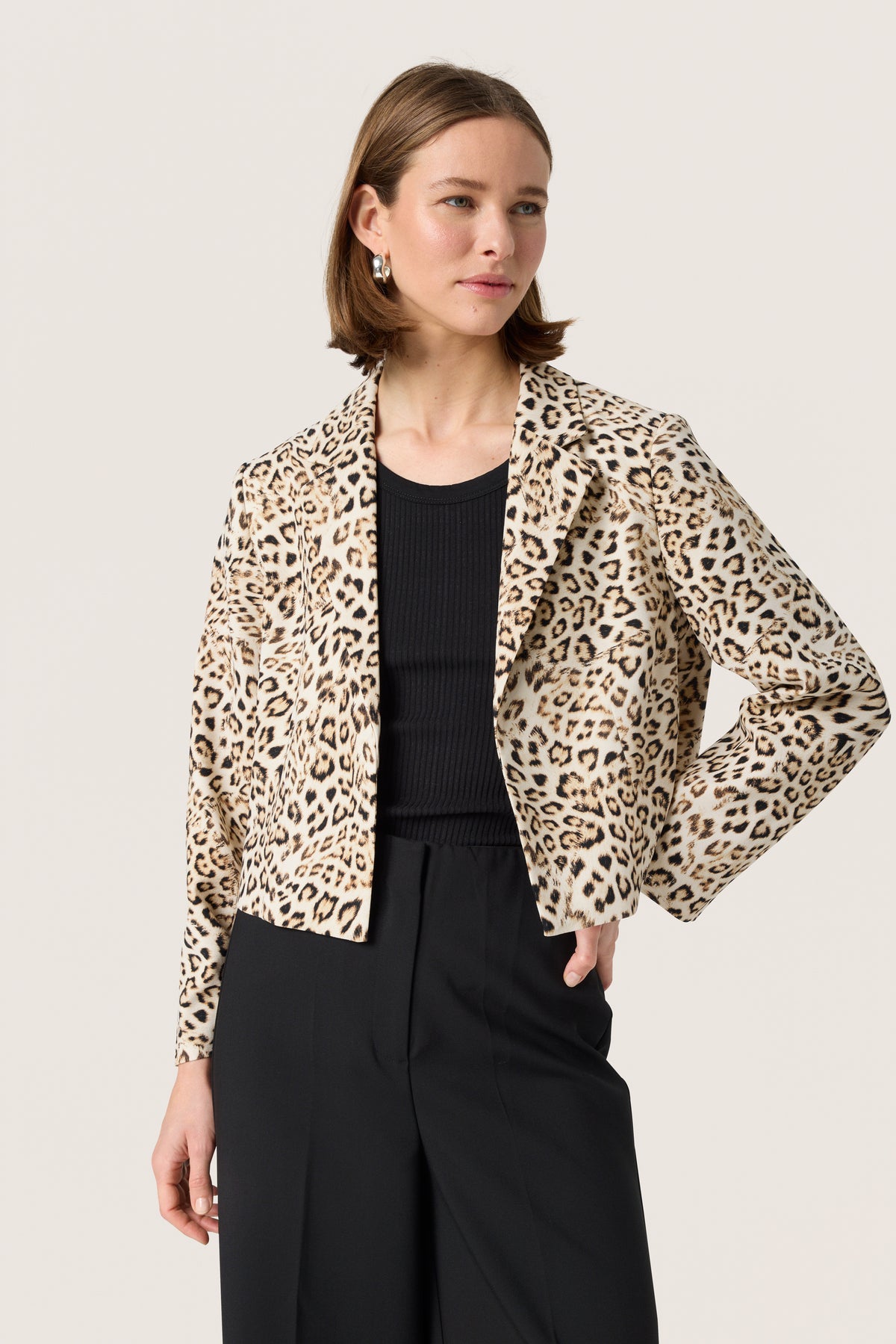 Cropped blazer in a bold leopard print with a classic lapel and straight cut. The structured fabric and modern length create a sharp, polished look. The model is 178 cm tall and wears size M.