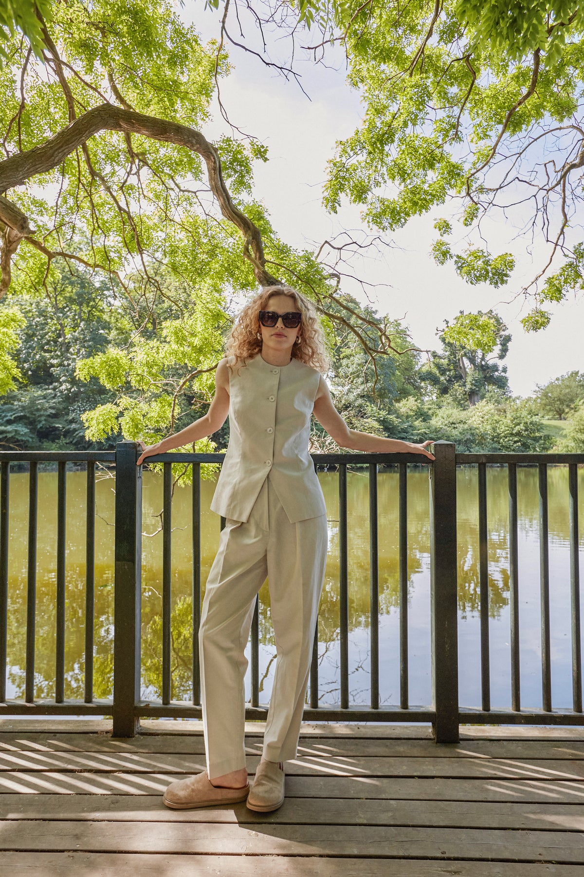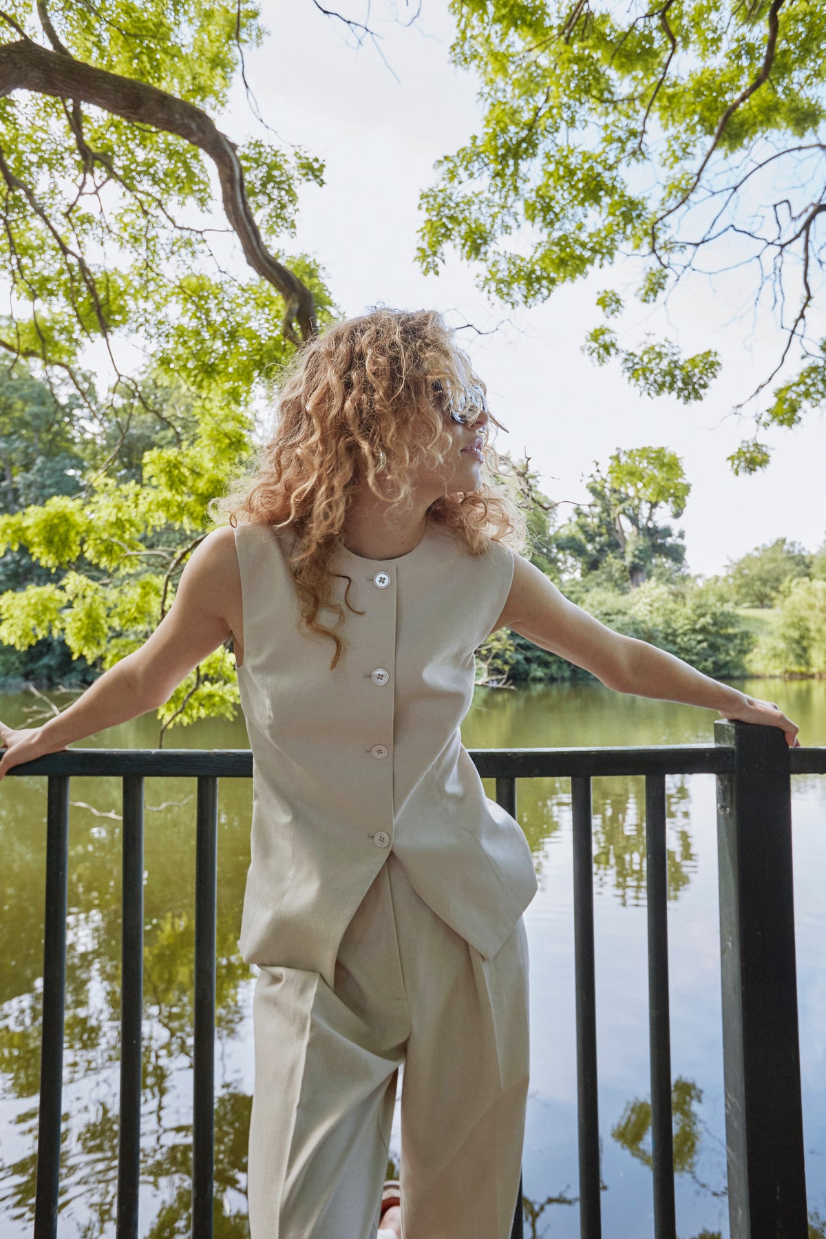 Elegant linen vest with a classic design and front button closure. The lightweight and breathable fabric makes it ideal for warm days or layered styling. The model is 176 cm tall and wears size M. We recommend sizing up.