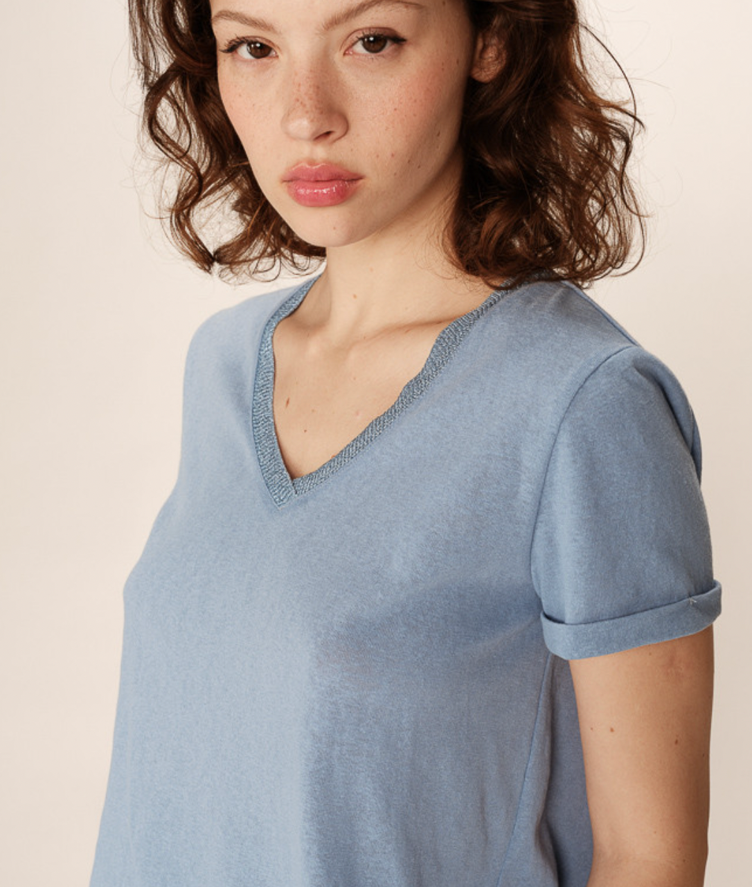 The PEPITO short-sleeve t-shirt features a lurex trim along the V-neckline, enhancing the neckline elegantly. With its short sleeves and straight cut, the PEPITO V-neck t-shirt is a staple of the collection. Made from natural fibers, this piece is part of our "A Touch of Green" range.